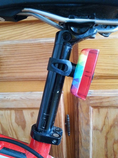 Le boîtier, qui est très original du fait qu’il soit multicolore, est étanche, ce qui permet de l’utiliser aussi par temps pluvieux, et se monte très facilement sur la tige de selle (de 22 à 32 millimètres de diamètre), grâce à une fixation en silicone qui se place sans outils.
